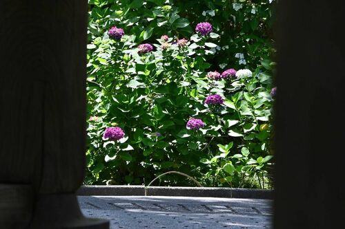 紫陽花の咲いている山の際と本殿を挟んで反対側を歩いていると 山門のぶっとい柱の向こう側に赤い紫陽花の花が見えた 手持ちのズームを最大限伸ばして撮ってみた @円覚寺