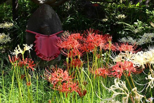 赤い前掛けを掛けてもらったお地蔵さん ちょっと苦しそう @常泉寺